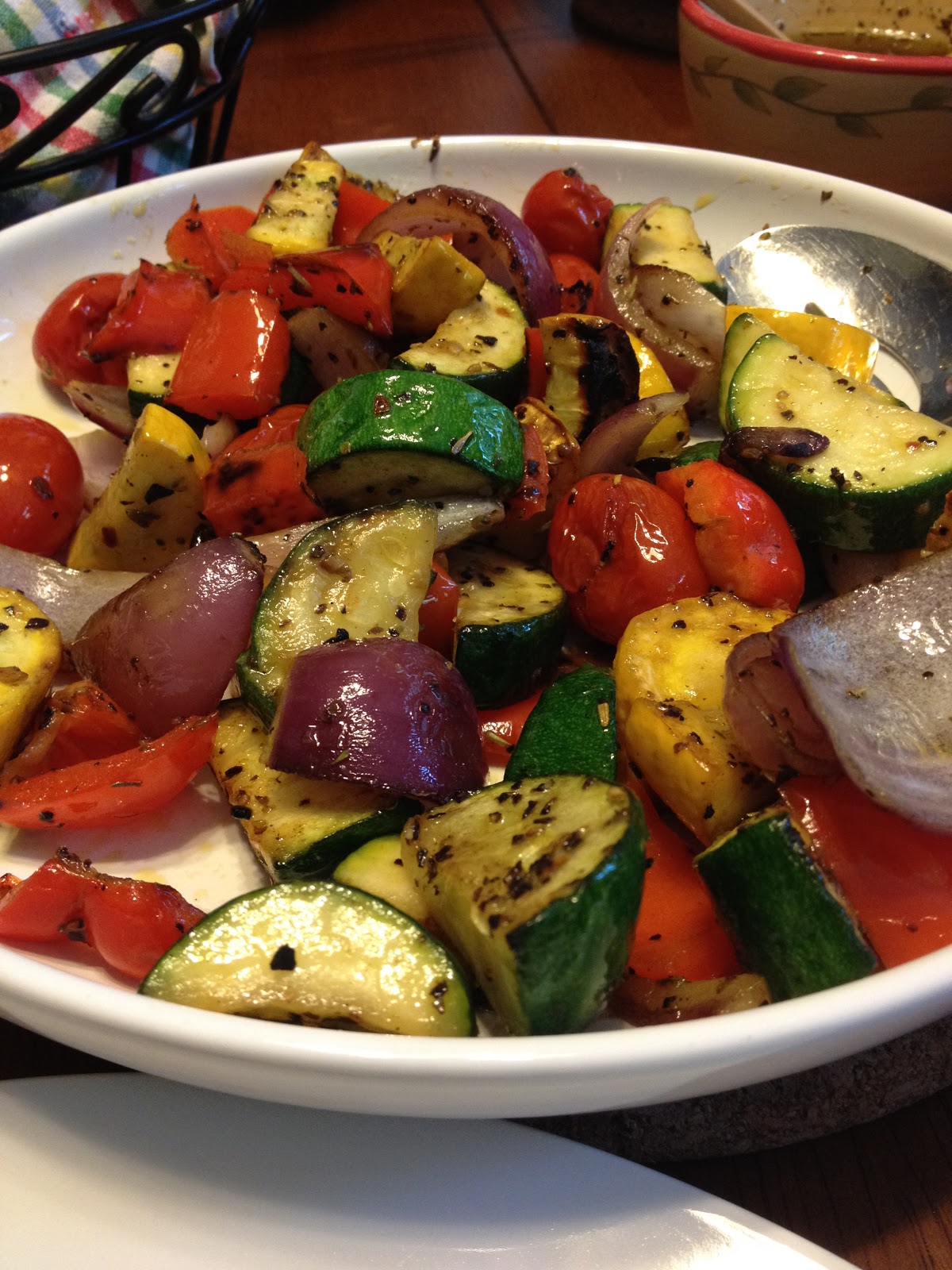These are my roasted veggies and how I made them - I use one small green zucchini and one small yellow squash, 1/2 red onion, 1/2 red pepper, and a handful of grape tomatoes, salt, pepper, herbs de provence, garlic and olive oil. Toss this all together in a bowl and then put into a grill basket on the grill. Grill until lightly browned, tossing as they are cooking. The flavor of them is amazing! Eat them plain, mixed with hot pasta, mixed into a pasta salad, as a veggie sandwich maybe add regular cheese or vegan cheese, these are a few ideas, but many different ways to use them.